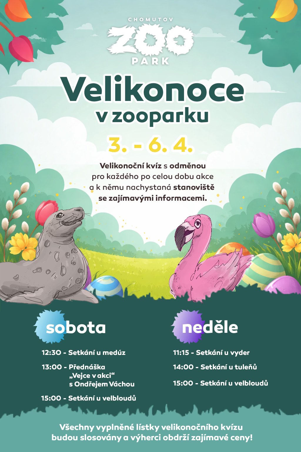 V chomutovském zooparku vypukne velikonoční veselí naplno od pátku 3. do pondělí 6. dubna. Hlavním tahákem je velikonoční kvíz, který vás provede areálem pomocí speciálních informačních stanovišť. Každý, kdo kvíz vyplní a odevzdá v Zooshopu, dostane okamžitou odměnu. Navíc se hraje o víc – všechny odevzdané lístky postoupí do slosování o hodnotné ceny.