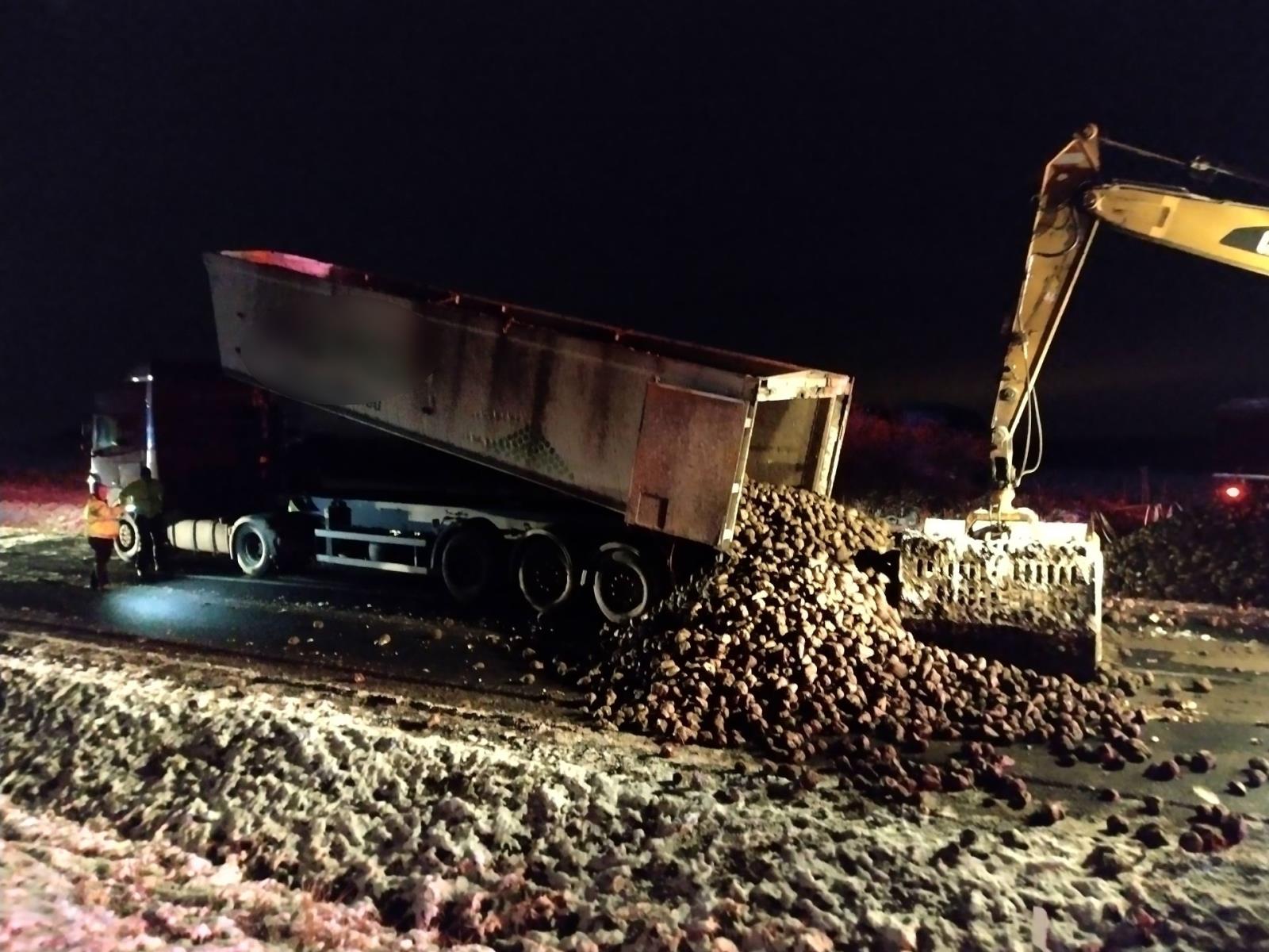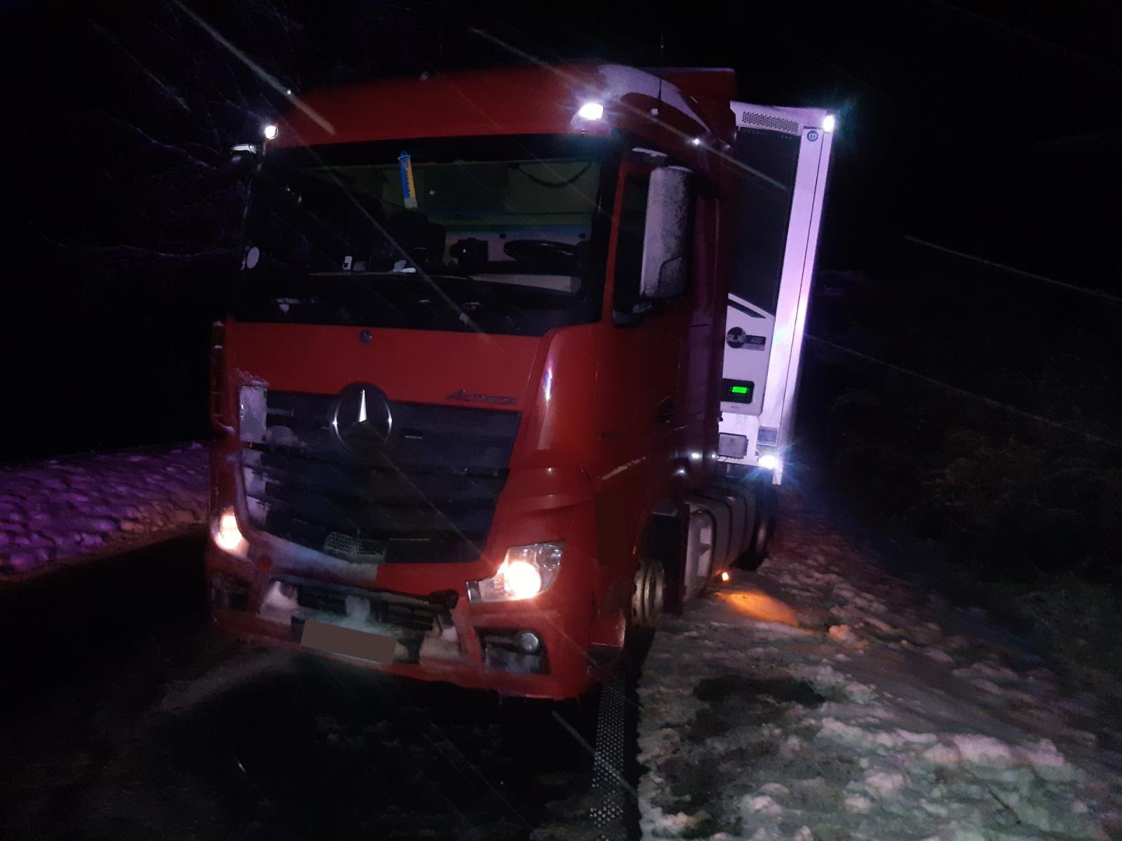V 17:35 hodin hasiči ze stanice Chomutov a dobrovolní hasiči obce Březno zasahovali u obce Kopeček na Chomutovsku. Kamion na kluzké vozovce uvízl na krajnici a hrozilo jeho převrácení. Hasiči vozidlo zajistili proti dalšímu sklouznutí z komunikace a přivolaný bagr pomohl s překládkou převážené řepy na pole.