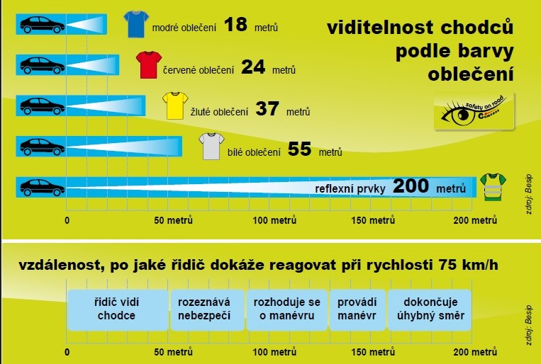 Reflexní materiál je v noci vidět na 3x větší vzdálenost než bílé oblečení a více než 10x větší vzdálenost než oblečení modré. Při rychlosti 75 km/h potřebuje řidič nejméně 31 metrů (1,5 sekundy) na to, aby si uvědomil nebezpečí a odpovídajícím způsobem zareagoval. Pouze s reflexními materiály mu chodci a cyklisté dají dostatek času!