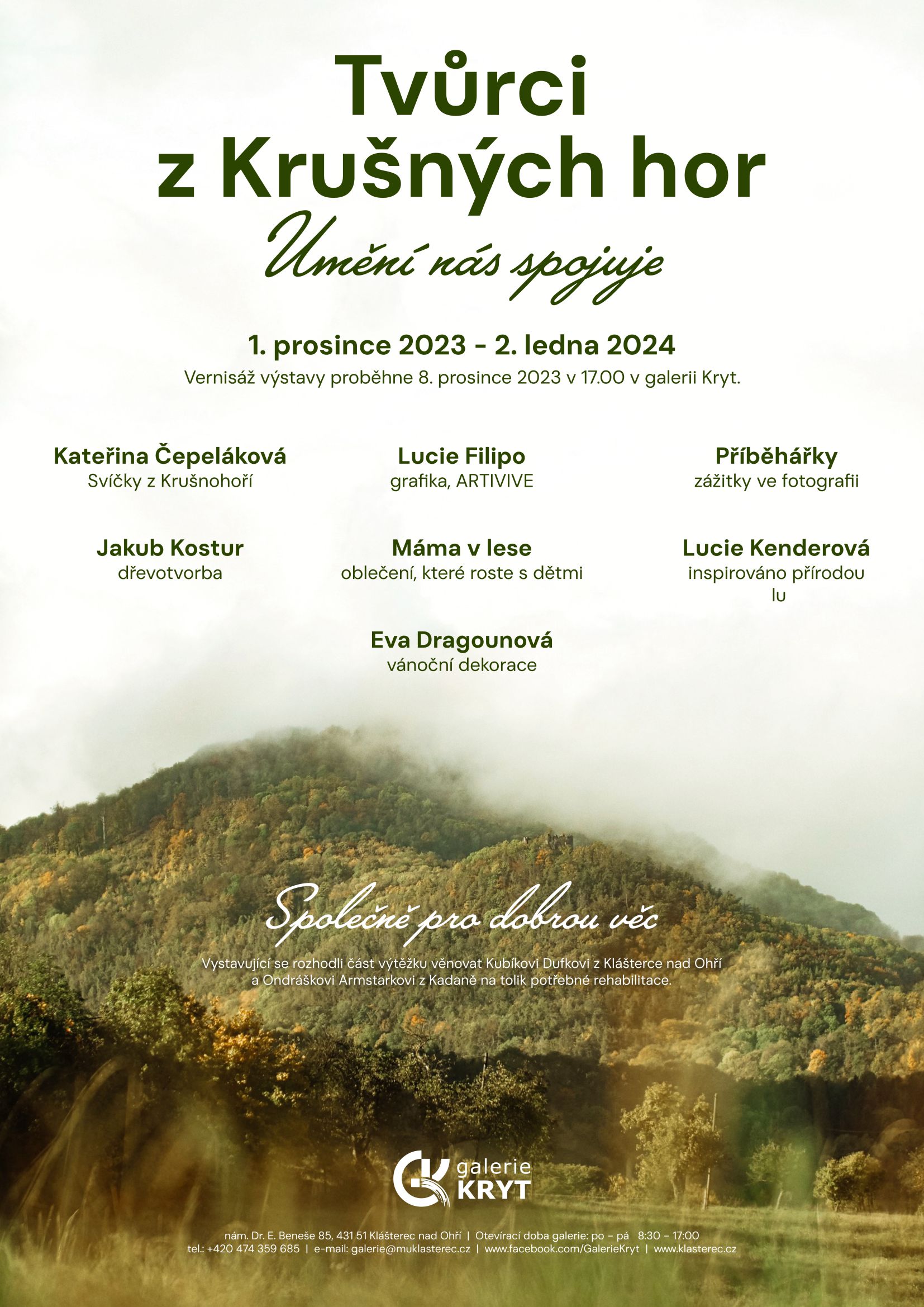 Zajímá vás, jak se tvoří v Krušných horách? Máte rádi dřevo? Šperky? Zajímají vás udržitelnost? Zážitkové focení? Nebo dáváte přednost grafice či malbě? Obdivujete umění ručních prací či máte prostě jen… rádi přírodu Krušných hor? Tak právě pro vás bude prosincová výstava ten nejlepší předvánoční zážitek!