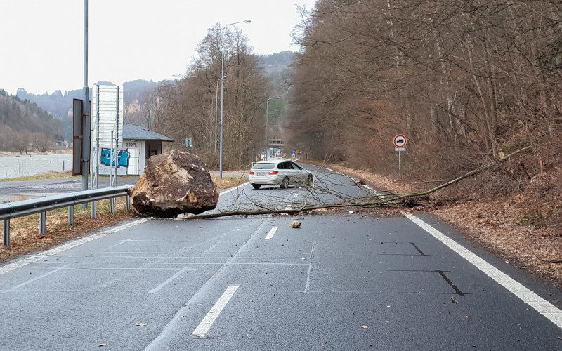 Hřensko – Ve středu 24. ledna se na silnici mezi Hřenskem a státní hranicí svalil balvan o velikosti osobního automobilu. K sesunutí došlo stovky metrů od obce Hřensko, které chrání bariéry za třičtvrtě miliardy korun. Na místě jsou hasiči a pracovníci NP České Švýcarsko.