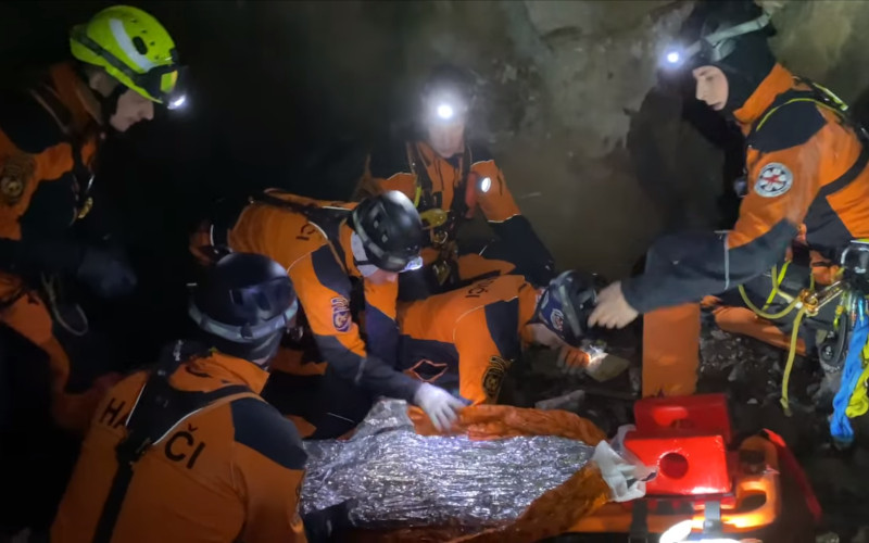 Hasiči cvičili vyhledání, poskytnutí neodkladné zdravotnické péče s tepelným komfortem a následný transport těžkým stísněným terénem starého důlního díla v Krupce.