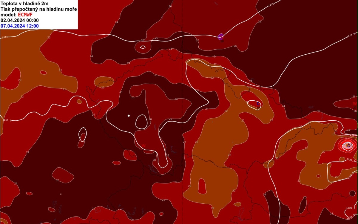 Už řadu dní panuje v numerických modelech výrazná shoda nad víkendovým výrazným oteplením. Příliv extrémně teplého vzduchu od jihozápadu by měl vrcholit právě o víkendu, ale zdá se, že velmi teplý vzduch přetrvá v prostoru střední Evropy i na začátku příštího týdne. Víkendové teploty se budou pohybovat kolem 25 °C, v neděli by mohly lokálně dosahovat až k 27 °C, což je naprostý extrém pro začátek dubna. „Tyto teploty jsou o neuvěřitelných 15 až 18 °C nad průměrem (vztaženo k období let 1979 až 2010)," informuje ČHMÚ.