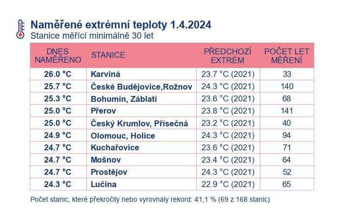 Přiložená tabulka překonaných teplotních „rekordů“ tradičně zobrazuje stanice s délkou měření alespoň 30 let. Teplotní extrém byl pro dnešní den zaznamenán na více než 40 % z nich.
