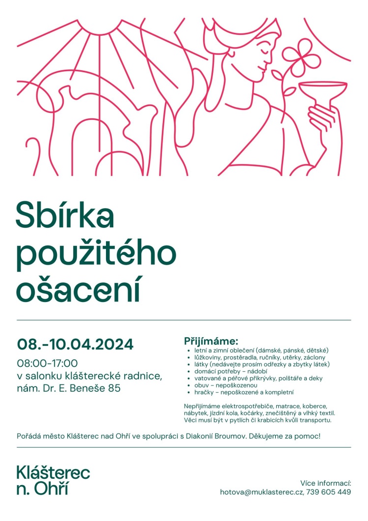 Klášterec nad Ohří – Do dnešních 17 hodin mají lidé možnost do salonku klášterecké radnice nosit nepotřebné ošacení, ale i obuv, peřiny či přebytečné nádobí. Sbírku pořádá město ve spolupráci s Diakonií Broumov.