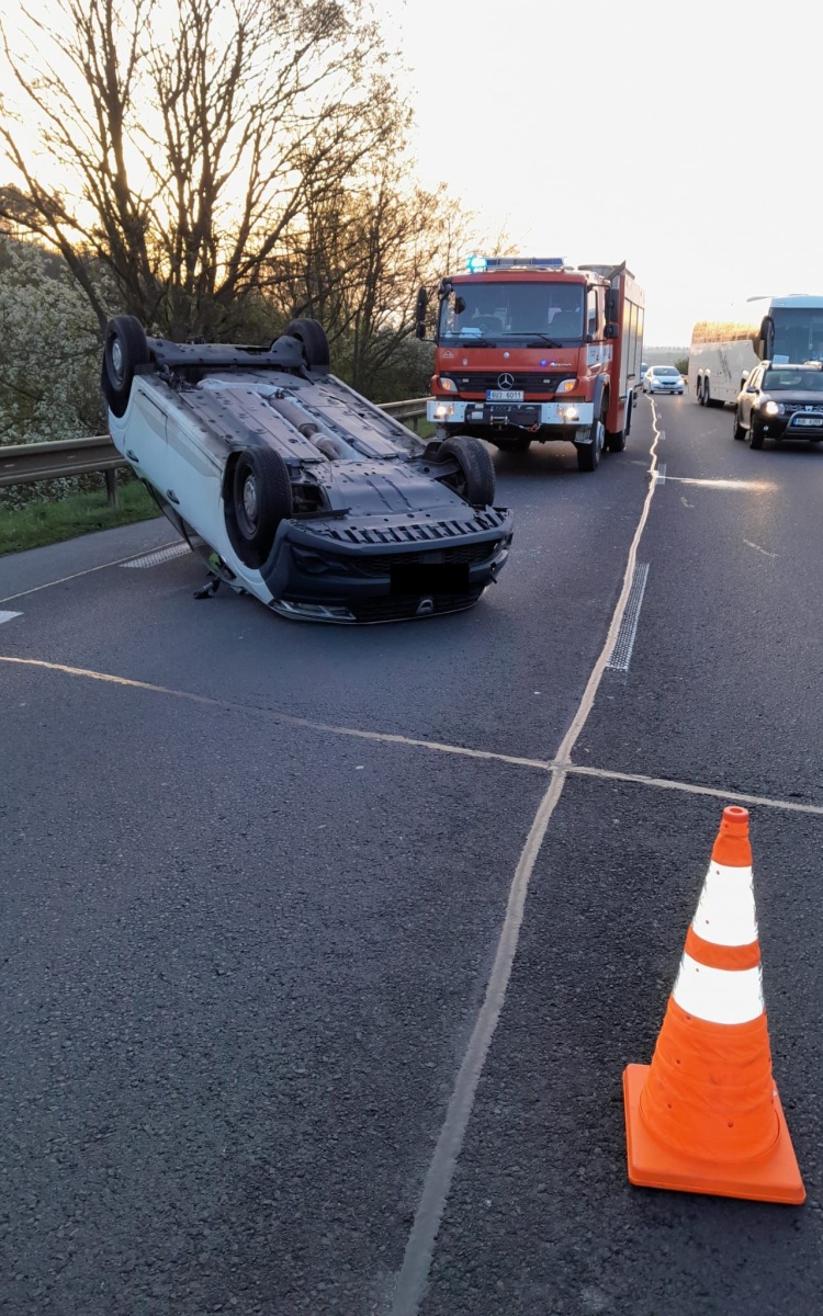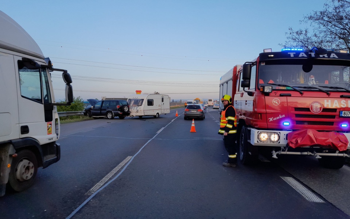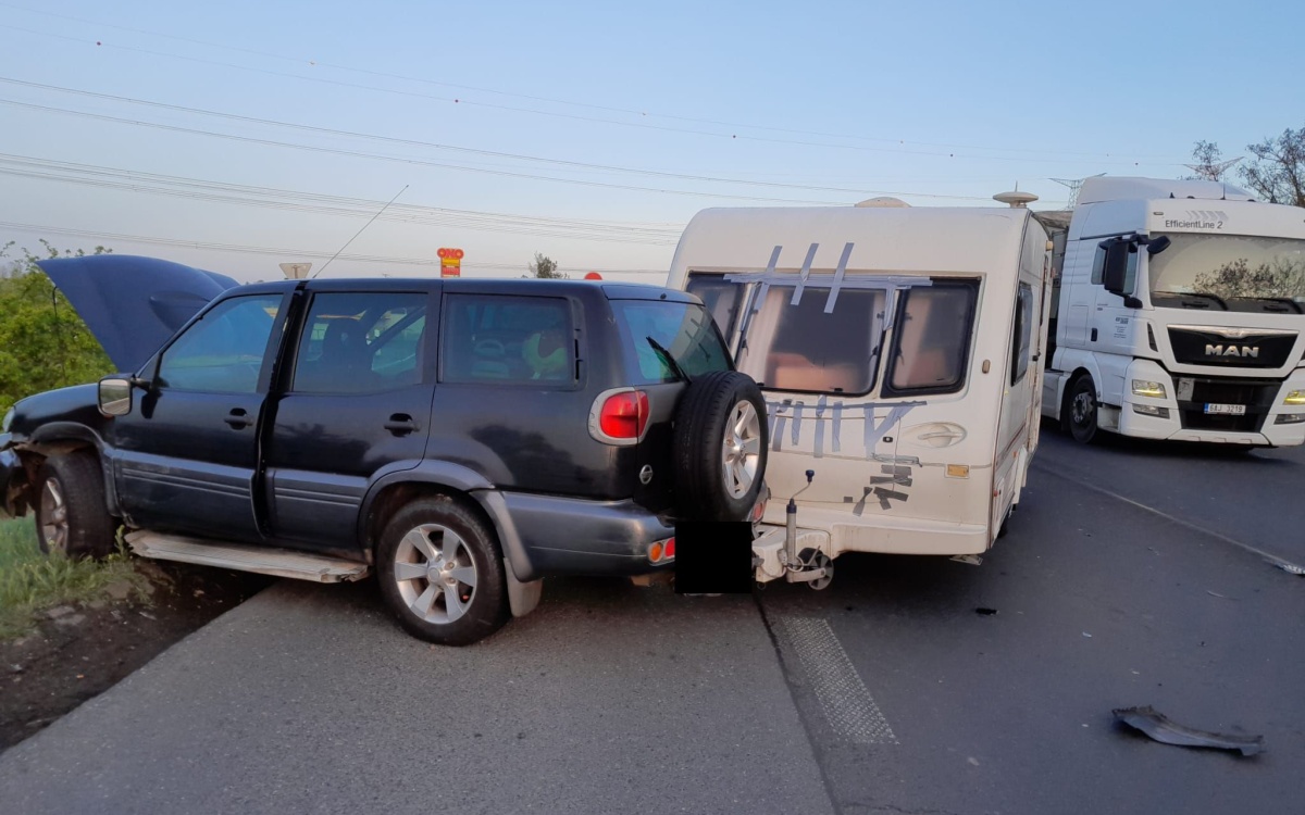 Postoloprty – V půl sedmé ráno skončila neplánovaně jízda osobního vozu s karavanem a dalšího osobního vozu na R7 za Postoloprty na úrovni obce Březno nedaleko čerpací stanice ONO. Po nehodě zůstal osobní vůz na střeše.