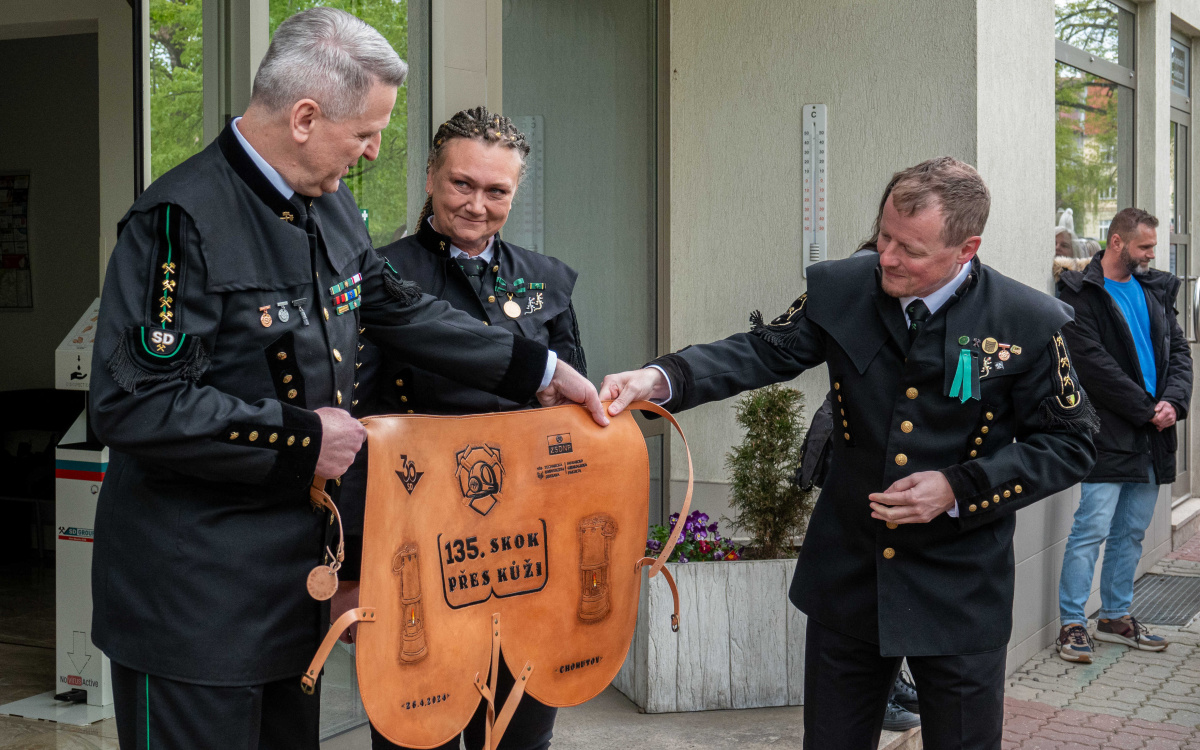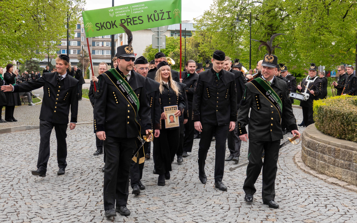 Chomutov – V pátek 26. dubna se v Chomutově uskutečnil tradiční průvod studentů hornictví s názvem Skok přes kůži, který letos slavil již 135. výročí. Průvod dorazil před chomutovskou radnici, kde je přivítalo vedení města v čele s primátorem Markem Hrabáčem a jeho náměstky Milanem Märcem a Milanem Petrilákem.