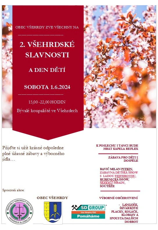 Všehrdy – V sobotu 1. června 2024 se konají na bývalém koupališti již 2. Všehrdské slavnosti a Den dětí. Začátek akce je od 15 hodin.