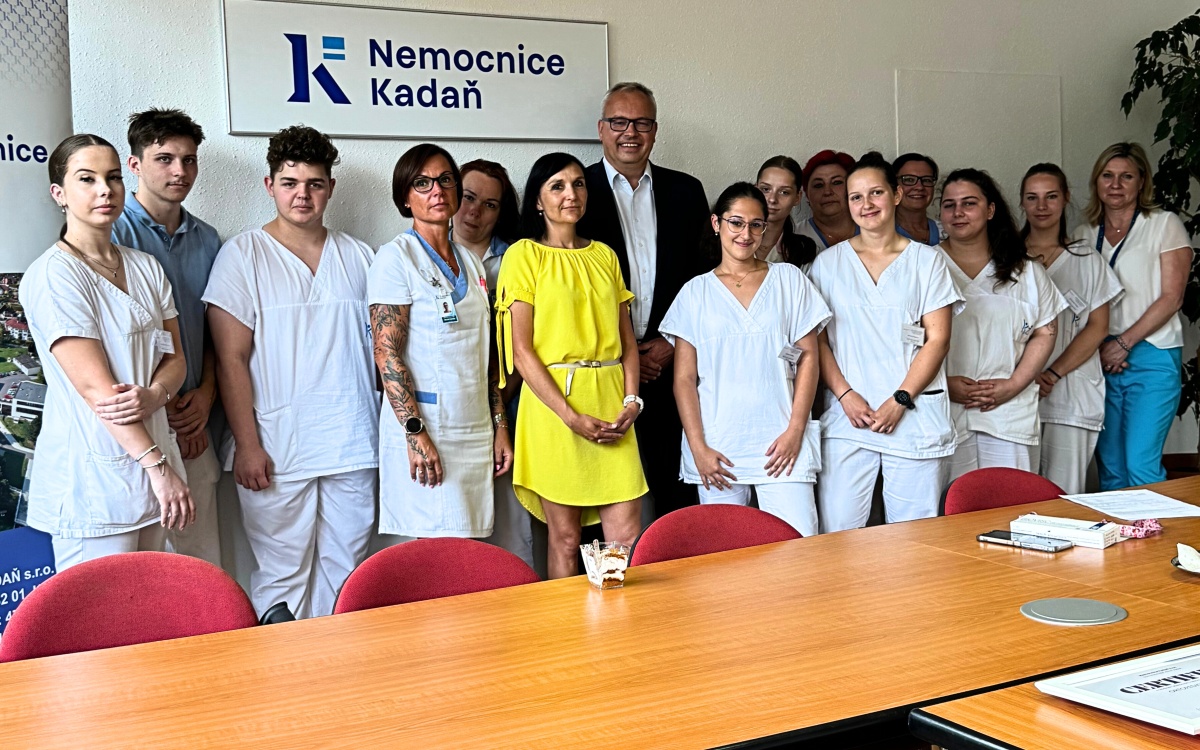 Ve středu 26. června se uskutečnilo za přítomnosti ředitele MUDr., Bc. Petra Hossnera, MBA, hlavní sestry Moniky Grof a třídní učitelky Mgr. Jany Razakowské slavnostní předání certifikátů o absolvování praxe, dárkových košů a poukazu do nemocniční lékárny. Téměř všichni tito studenti u nás zůstávají na letní brigádu a naším přáním je, aby se k nám po škole vrátili. Máme pro ně lákavá stipendia, maximální podporu práce při studiu, možnost zaměstnaneckého ubytování, jistotu stabilní práce a mnoho dalších benefitů.