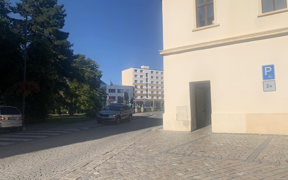 Před vchodem do staré budovy radnice je zaparkované neoznačené policejní auto. Foto: Jitka Fárová
