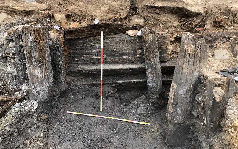 Při pokračujícím bagrování byly níže nalezeny dřevěné kůly a vodorovně uložené trámy, mezi nimiž se podařilo rozlišit tři různé konstrukce, ležící v rozdílné hloubce. Nejvýraznější z nich tvořila základ dřevěné stěny z mohutných kuláčů, patrně předchůdkyně kamenné ochranné zdi z 19. století. Nejspíš se jednalo o dřevěné nábřeží starší fáze areálu, podle doprovodné keramiky přibližně z 16. až první poloviny 19. století. Další byla obdobná ale hlouběji uložená fošnová stěna a poslední byl dřevěný rošt, patrně základ dřevěné stavby.