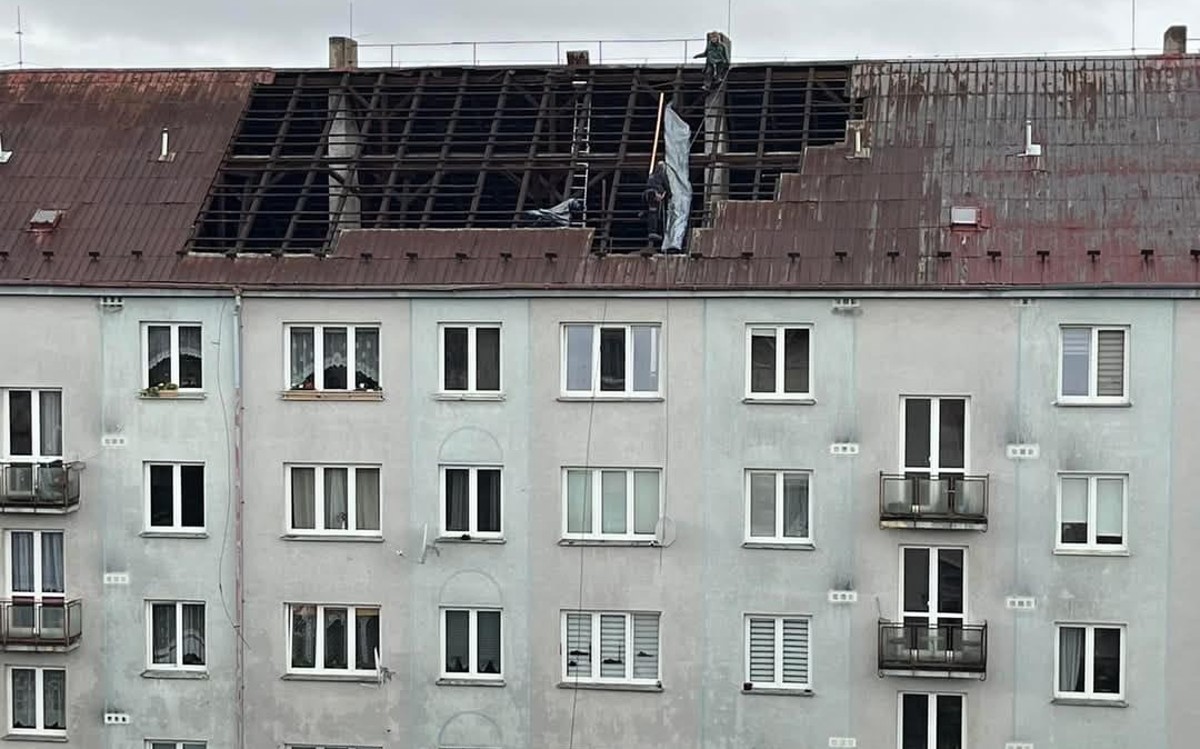 Prkna, která držela plachtu, která provizorně zakrývá utrženou střechu, už jsou dle lidí také mimo své původní místo. Foto: město Jirkov