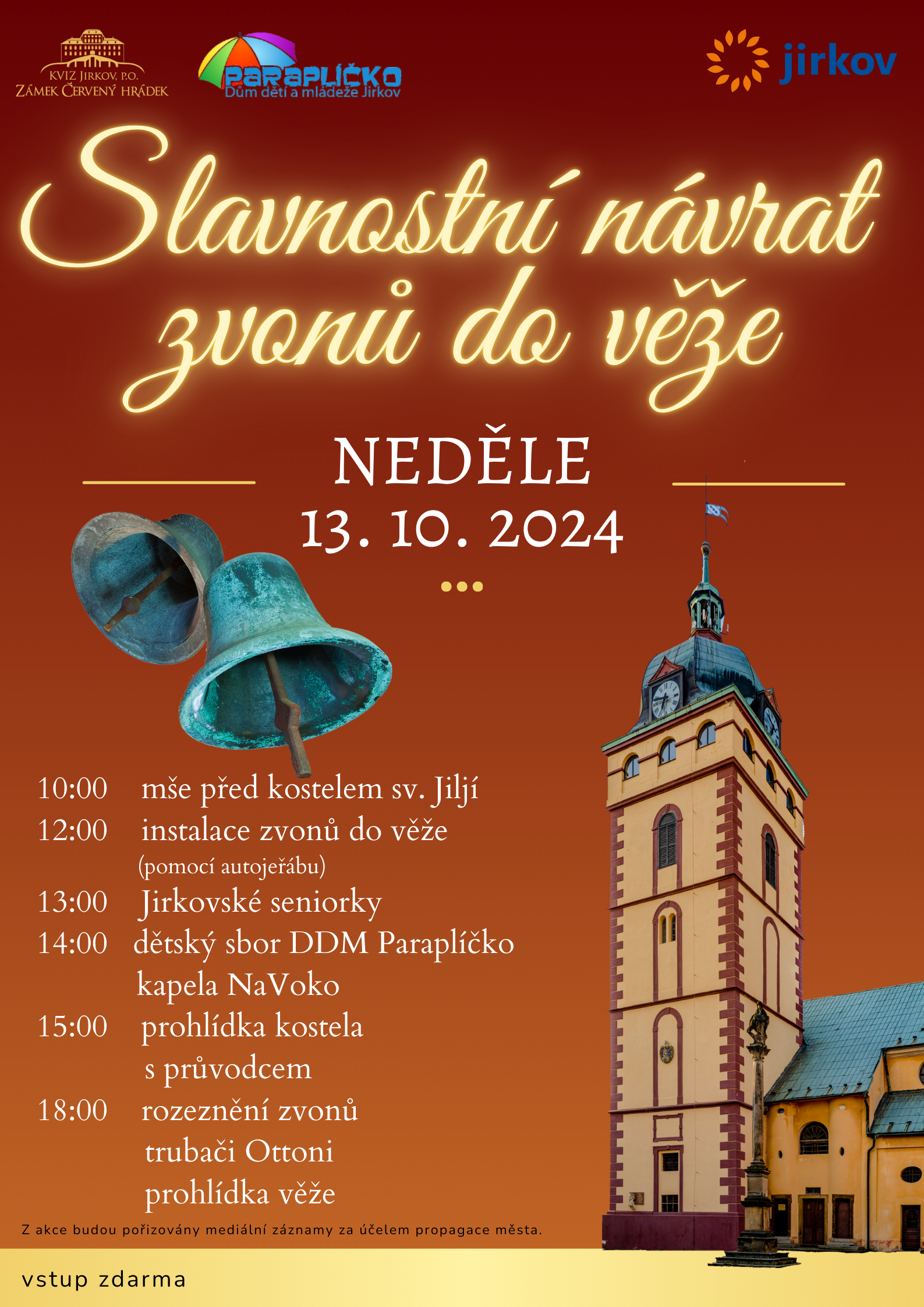 Jirkov – Restaurátor Petr Rudolf Manoušek z pražského Zvonařství na Zbraslavi přiveze v neděli 13. října ze své dílny do Jirkova dva zvony, které se po sedmi měsících vrátí do městské věže.