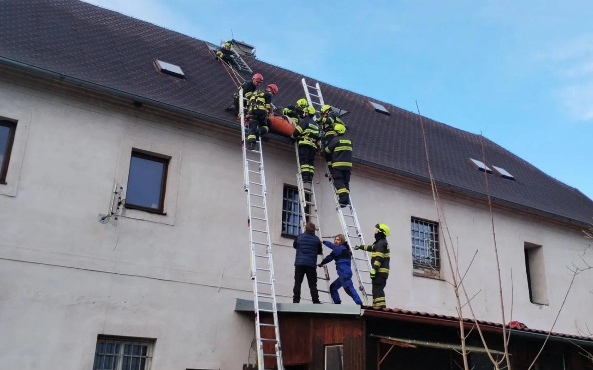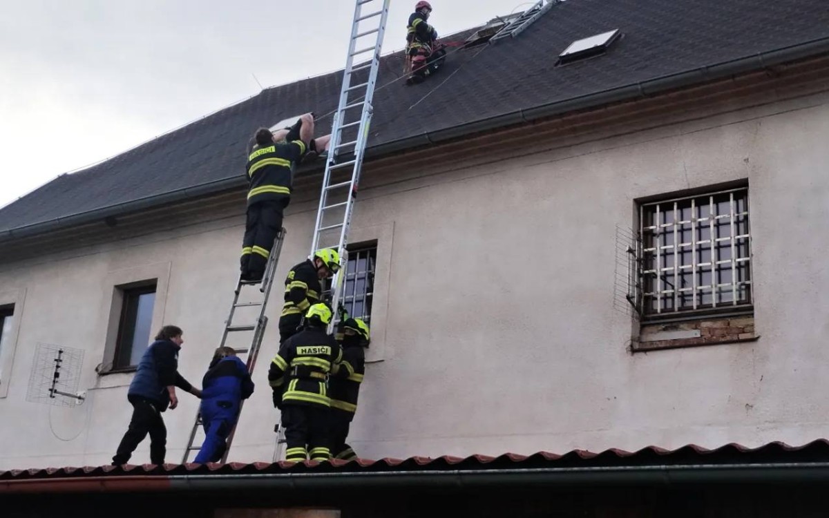 Křimov – Netradiční zásah mají za sebou hasiči v Křimově. V neděli byli přivoláni k pádu muže ze střechy. Nespadl naštěstí až na zem, zůstal zaklíněn na okraji střechy u okapu.