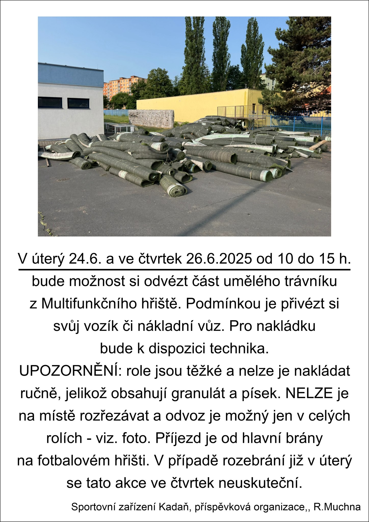 Město Kadaň nabízí zdarma použitý umělý trávník z hřiště. K osobnímu odběru budou v úterý 24. a případně ještě ve čtvrtek 26. června, pokud ještě nějaké zbydou. „Role jsou těžké a nedají se nakládat ručně, pro nakládku bude k dispozici technika. Role je nutno odebírat celé," upozorňuje společnost.