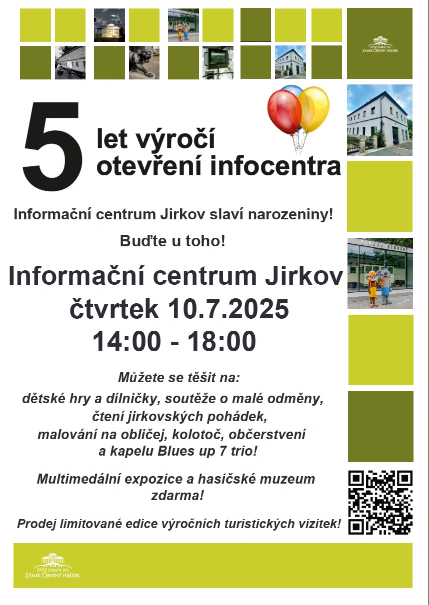 Jirkov – Informační centrum Jirkov dnes slaví své páté narozeniny. Od 14 do 18 hodin čeká návštěvníky bohatý program plný dětských her, tvořivých dílniček, soutěží o odměny, čtení jirkovských pohádek. Otevřené budou zdarma oblíbené expozice – multimediální výstava o Jirkovu i jediné hasičské muzeum svého druhu v republice..