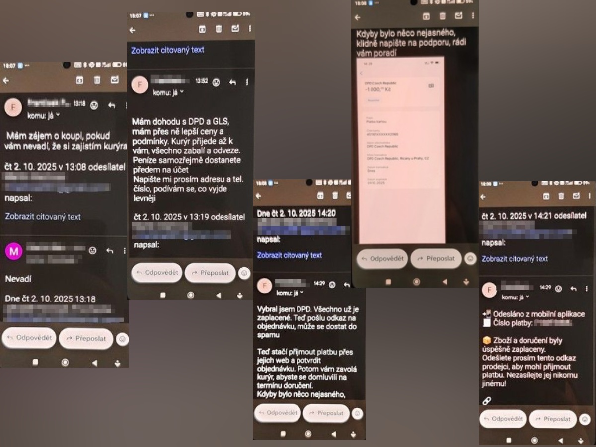 Poté, co prodávající zveřejnil inzerát, přišel mu e-mail, v němž pisatel projevil o nabízené pneumatiky zájem a následně napsal, že má dohodu se společností DPD a GLS, přes které má lepší ceny. „Prý pokud se na prodeji spolu domluví, tak na adresu prodávajícího přijede kurýr, vše zabalí a odveze a prodávající dostane své peníze předem. To vypadalo lákavě, takže prodávající souhlasil. Vzápětí mu přišel e-mail, kde byl přiložen screenshot potvrzení o platbě ve výši 1 000 korun a internetový odkaz," popsala průběh podvodu policejní mluvčí Miroslava Glogovská.