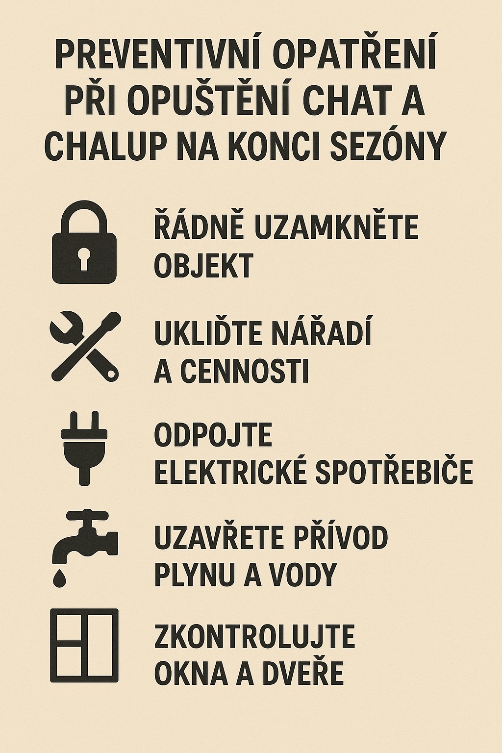 Muži zákona však upozorňují, že nemohou hlídat každou chatu nepřetržitě. „Není možné těmito kontrolami zcela obsáhnout veškeré rekreační oblasti a objekty, kdy zodpovědnost za svůj majetek a za jeho řádné zabezpečení, přeci jen leží v rukou samotných chatařů a chalupářů,“ uzavírá policejní mluvčí.