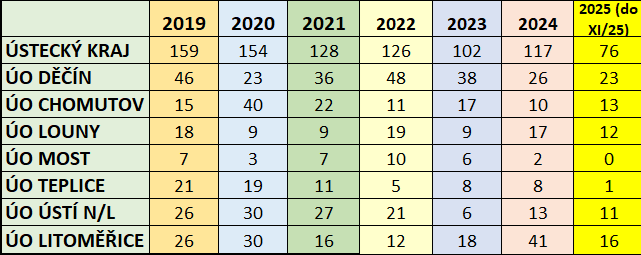 Oproti loňskému roku, který byl s pouhými 10 případy rekordně klidný, jde o mírný nárůst. Stále jsme však daleko od čísel z „covidového“ roku 2020, kdy zloději na Chomutovsku udeřili celkem 40krát. V porovnání s ostatními okresy je na tom Chomutovsko lépe než Děčínsko (23 případů) nebo Litoměřicko (16 případů), ale hůře než sousední Mostecko, kde letos nehlásí jediný případ.