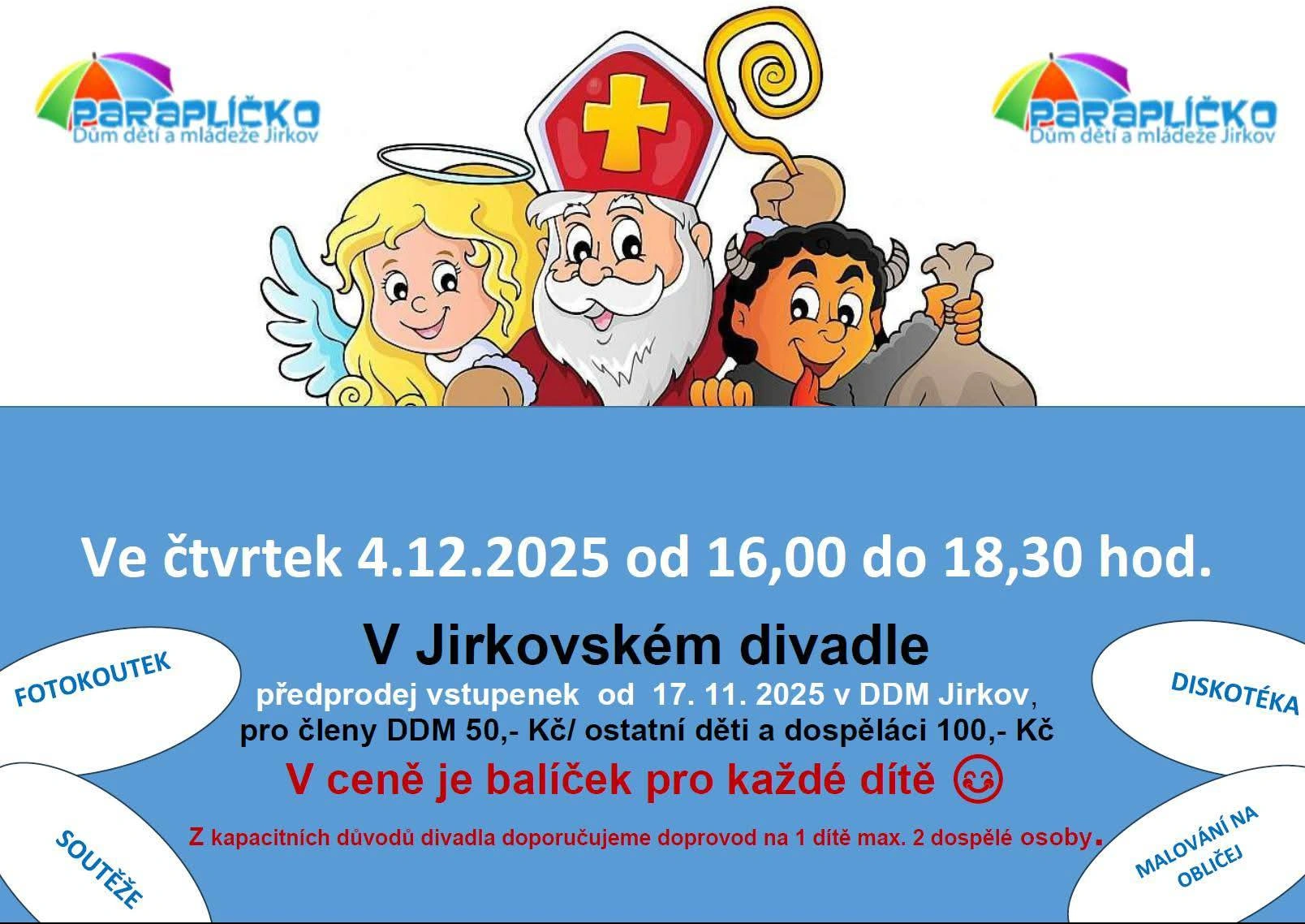 Už od odpoledních hodin ožije Jirkovské divadlo. Dům dětí a mládeže Paraplíčko Jirkov zde pořádá velkou mikulášskou akci, která startuje v 16:00 a potrvá do 18:30 hodin.