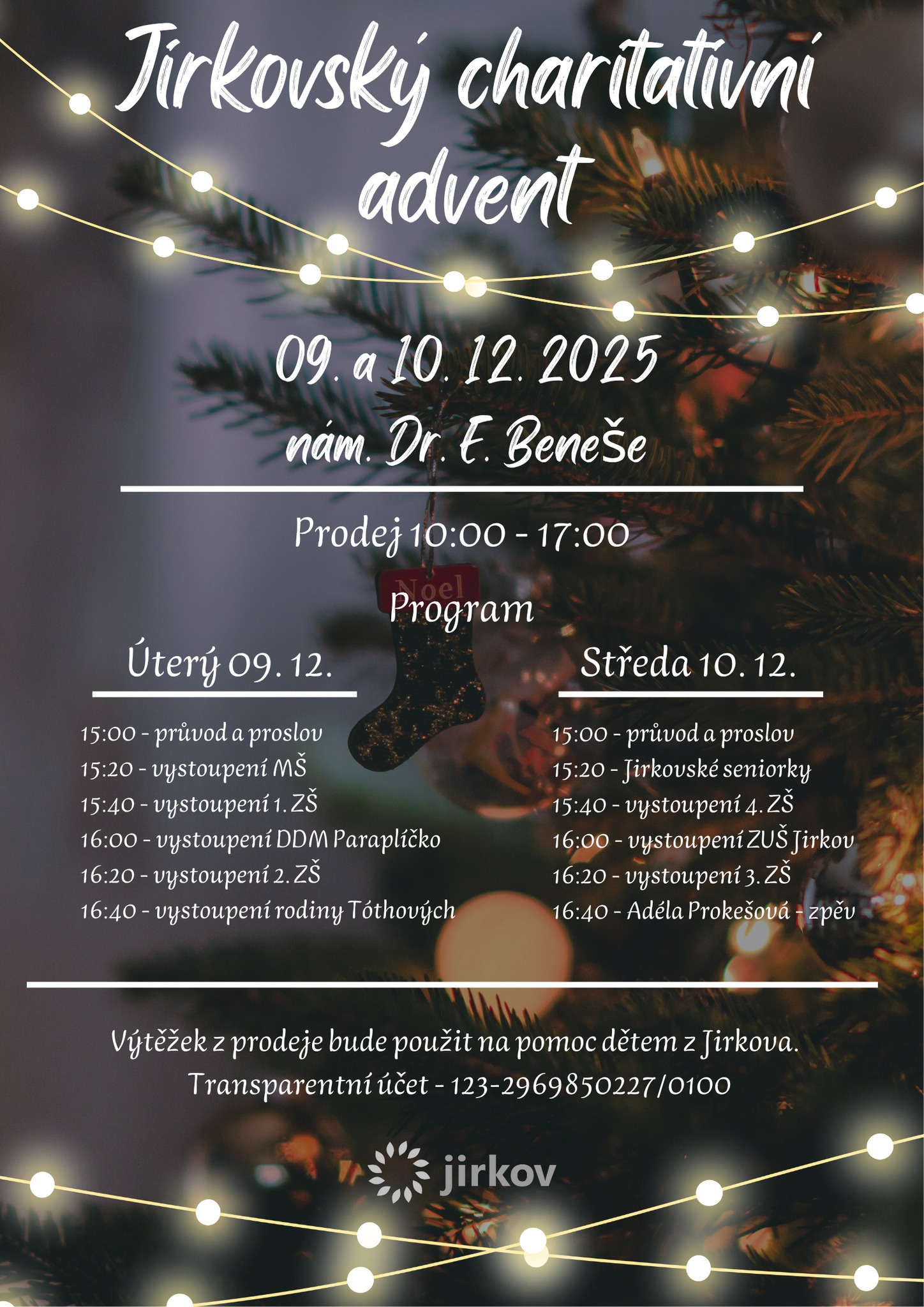 Jirkov – Náměstí Dr. E. Beneše v Jirkově se tento týden zahalí do sváteční atmosféry. Město chystá tradiční Jirkovský charitativní advent, který se uskuteční v úterý 9. a ve středu 10. prosince. Letošní ročník však bude mít kromě radosti z pomoci potřebným i tichý, pietní podtón. Jedním z posledních radostných úkolů, které stihla vykonat na podzim zesnulá starostka Dana Havlátková Jurštaková, bylo právě předání poukazů rodinám, kterým výtěžek pomáhá.