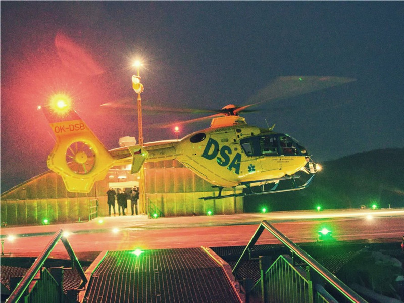 Během dvou zkušebních přistání – před soumrakem a po soumraku – piloti společnosti DSA s vrtulníkem Eurocopter EC 135 T2+ „Barča“, kteří zajišťují technický provoz pro ZZS ÚK, ověřovali funkčnost kompletního světelného a navigačního vybavení heliportu. Testován byl nový systém zapuštěných světel plochy FATO, který jasně vymezuje přistávací prostor, dále bílé směrové osvětlení určující hlavní a záložní osu přiblížení a moderní přibližovací systém A-PAPI, jenž pilotům poskytuje přesnou informaci o správné výšce a sklonu při přistání.