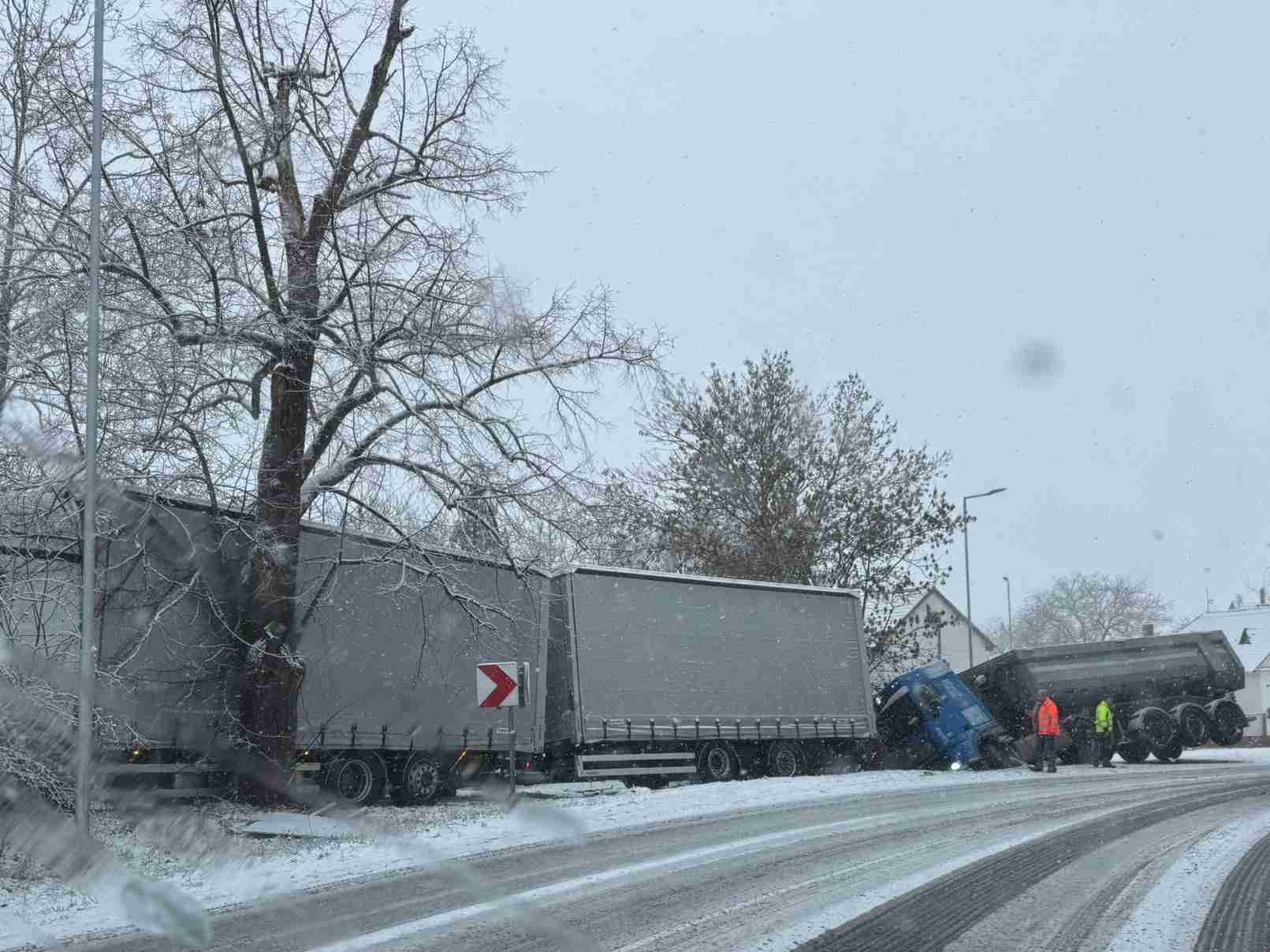 K další vážné nehodě došlo krátce po deváté hodině dopoledne u Podbořan na silnici č. 27. Zde se střetla dvě těžká nákladní vozidla. Místo je sice se zvýšenou opatrností průjezdné, ale řidiči musí počítat se zdržením.