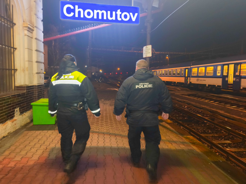 Chomutov - Hlídku Městská policie Chomutov jsme zastihli při pravidelné kontrole prostoru hlavního vlakového nádraží v Chomutově. Lokalita patří dlouhodobě mezi místa, kde strážníci vykonávají zvýšený dohled v rámci běžné hlídkové služby.