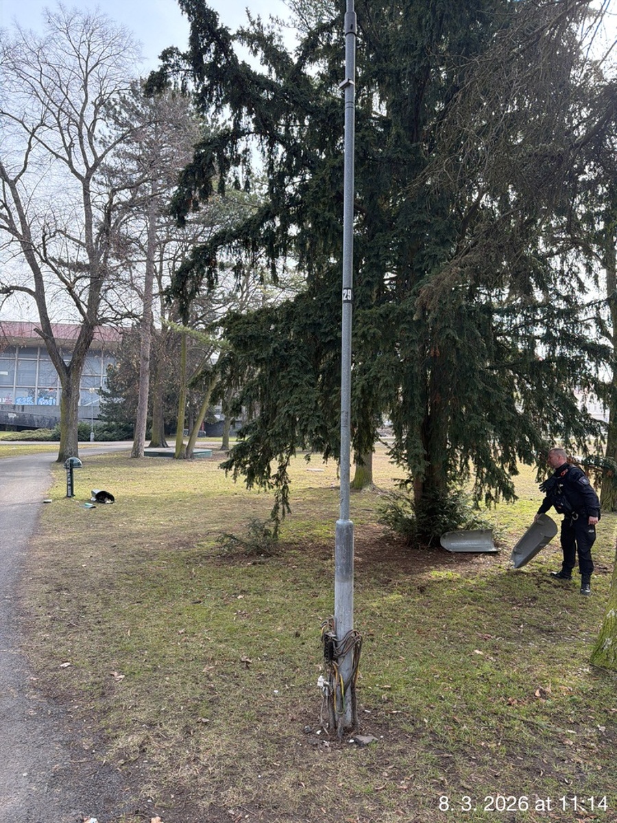 Při bližší kontrole strážníci zjistili, že se na místě nachází odkrytá a vážně poškozená lampa veřejného osvětlení. Poškozený sloup s odkrytými částmi elektroinstalace mohl být nebezpečný zejména pro děti a další osoby, které park běžně navštěvují.