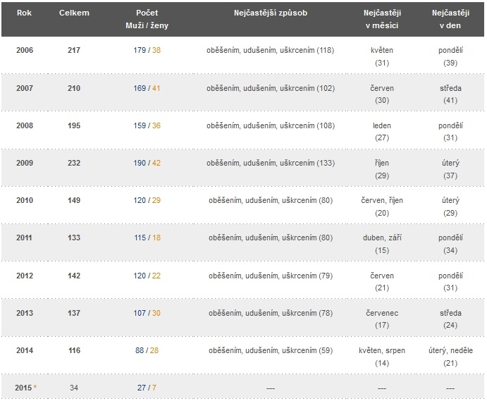 * Údaje známé k 20. 8. 2015 – neúplné údaje – pouze sebevraždy, u nichž bylo ukončeno šetření (kompletní statistika je k dispozici v dubnu následujícího roku).