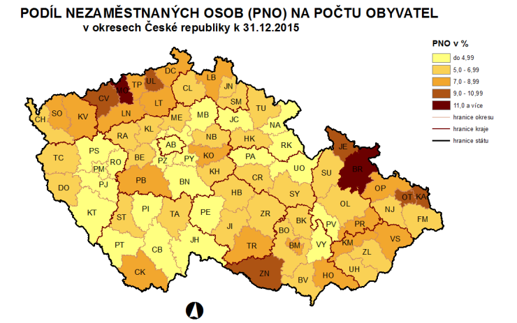 Nejnižší nezaměstnanost vykázaly okresy Praha-východ (2,6 %), Rychnov nad Kněžnou (2,9 %), Mladá Boleslav (3,5 %), Praha-západ (3,7 %), Benešov (3,8 %), Rokycany (3,9 %), České Budějovice (4 %), Jičín, Plzeň-jih a Pelhřimov (všichni 4,1 %). Podíl nezaměstnaných stejný nebo větší než republikový průměr hlásí 35 regionů. Nejvyšší byl v okresech Bruntál (11,6 %), Most (11,1 %), Karviná (11 %), Ústí nad Labem (10,4 %), Ostrava - město (10,1 %), Jeseník (9,5 %), Znojmo a Chomutov (oba 9,4 %).