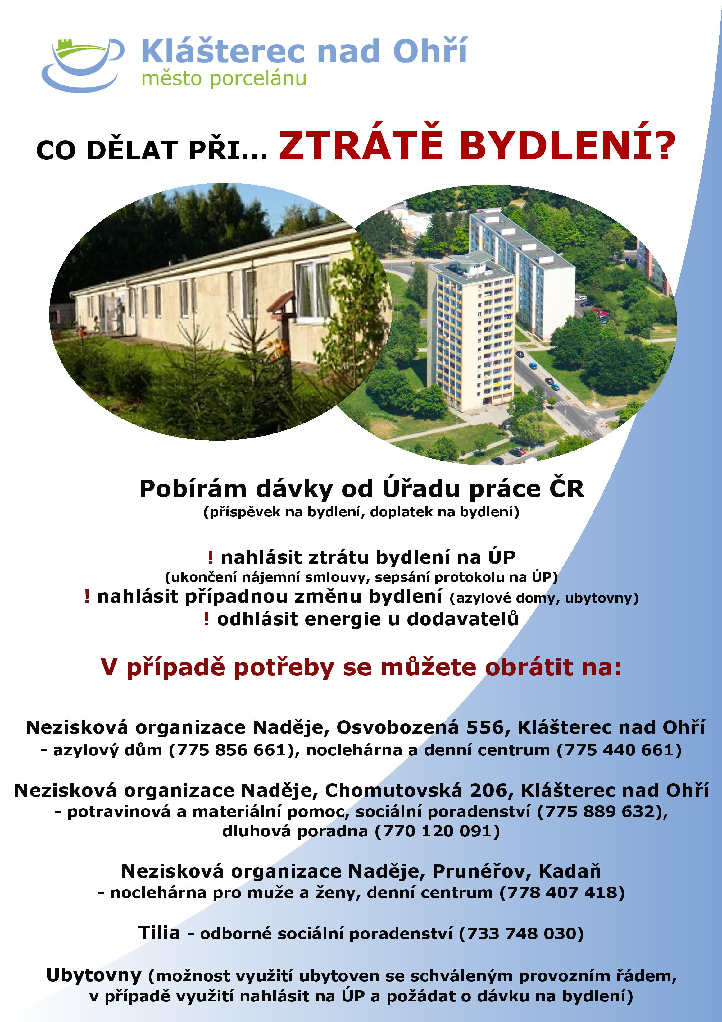 Zde jsou potřebné informace pro ty, co postihne ztráta bydlení, a případný seznam azylových domů.