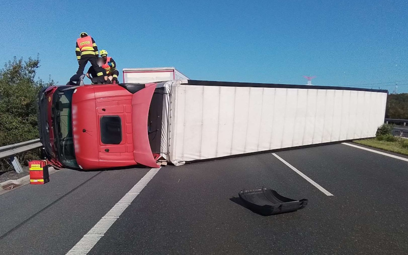 Keblice – V úterý 6. srpna krátce po deváté hodině ranní vyjíždělo několik jednotek hasičů k dopravní nehodě kamionu na D8 u Keblic. Kamion převážející OSB desky se převrátil přes celou šířku vozovky ve směru na Prahu.