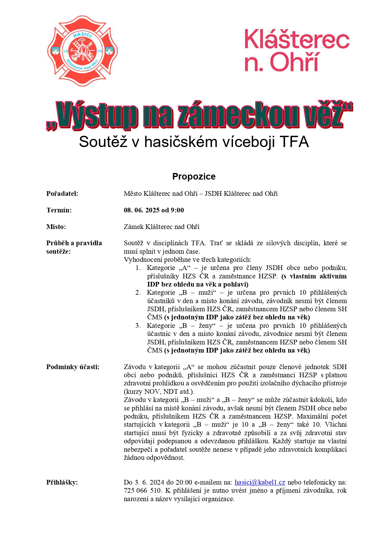 Klášterec nad Ohří - V neděli 8. června se uskuteční již 10. ročník tradičního hasičského víceboje TFA - výstup na zámeckou věž.
