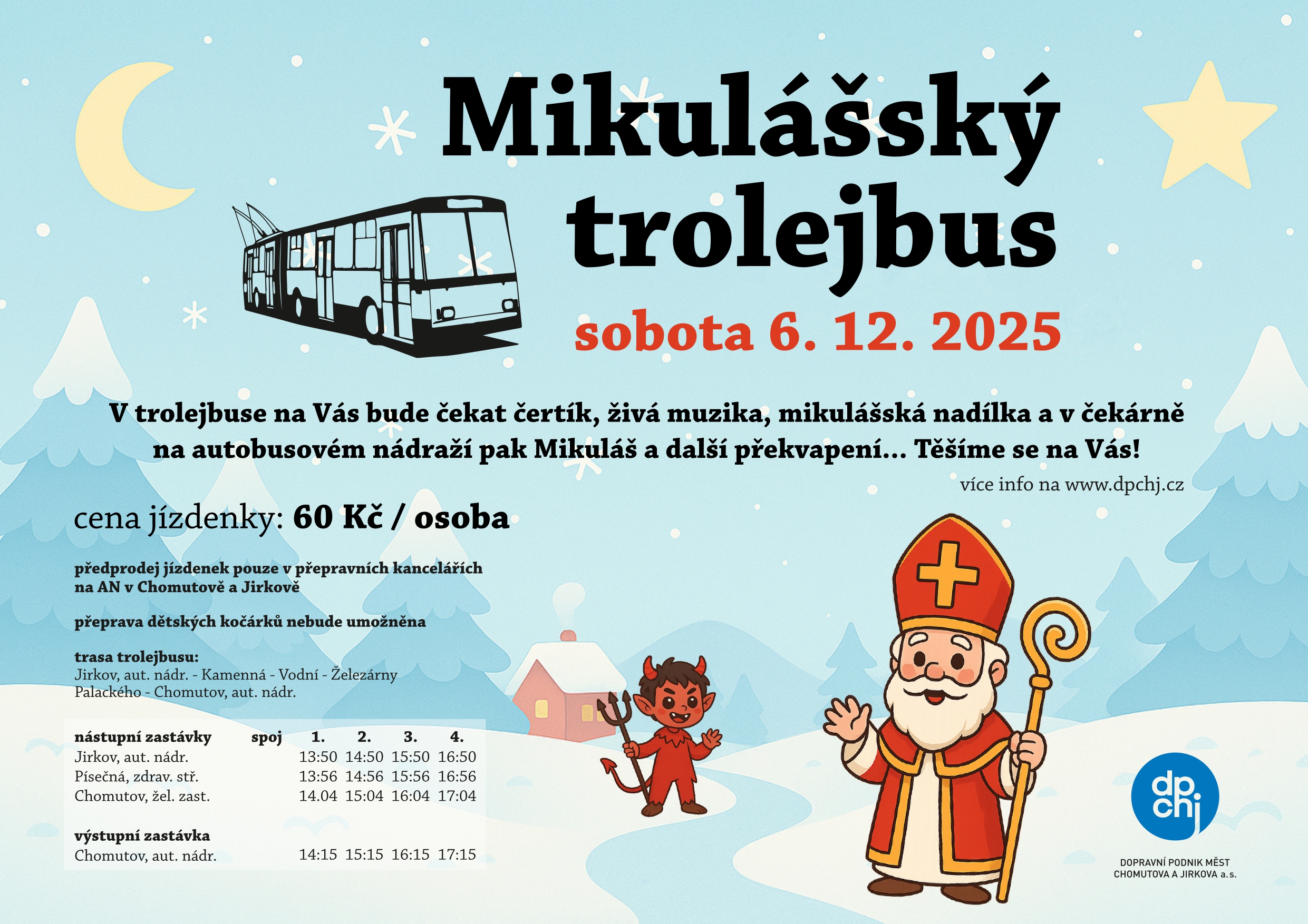 Chomutov, Jirkov – Předvánoční čas na Chomutovsku zpestří oblíbená tradice. Dopravní podnik měst Chomutova a Jirkova (DPCHJ) vypraví v sobotu 6. prosince 2025 speciální Mikulášský trolejbus. Historický vůz nabídne nejen nostalgickou projížďku, ale i živou hudbu a setkání s pekelníky.