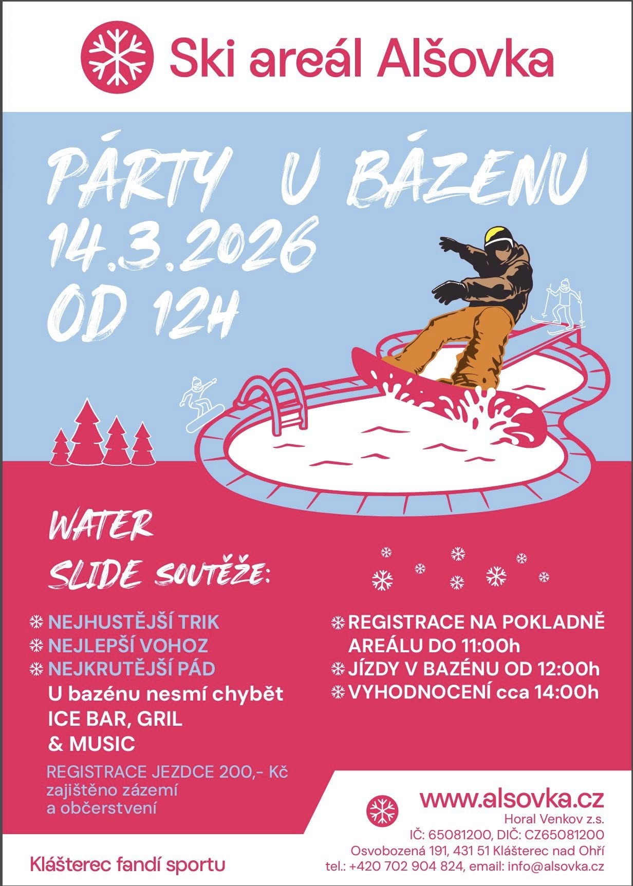 Párty odstartuje přesně v poledne, kdy se první odvážlivci spustí ze svahu přímo do připraveného bazénu. Soutěžit se bude v rámci takzvaného Water Slide v několika kategoriích, které rozhodně neberou ohled na klasické sportovní výkony. Porota i diváci budou hodnotit především nejhustější trik, ale také nejlepší „vohoz“ neboli nápaditost kostýmu. Speciální uznání pak tradičně sklidí ten, komu se podaří nejkrutější pád, který k této mokré disciplíně neodmyslitelně patří. Jak takový přejezd vodní hladiny vypadá, se můžete díky záběrům z loňského ročníku podívat ZDE.