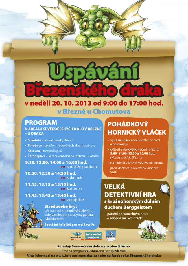U velkorýpadla KU800, které je vyhledávanou industriální památkou a má přezdívku Březenský drak, se bude od 9 do 17 hodin soutěžit o spoustu cen. V plánu je velká detektivní hra, při které budou děti spolu s krušnohorským duchem Berggeistem pátrat po kouzelném hesle. S těmi, kdo ho vyluští, odletí domů malý drak.