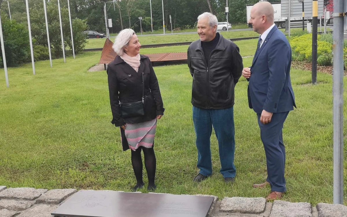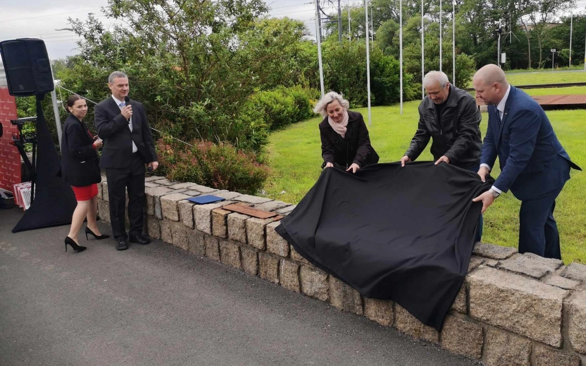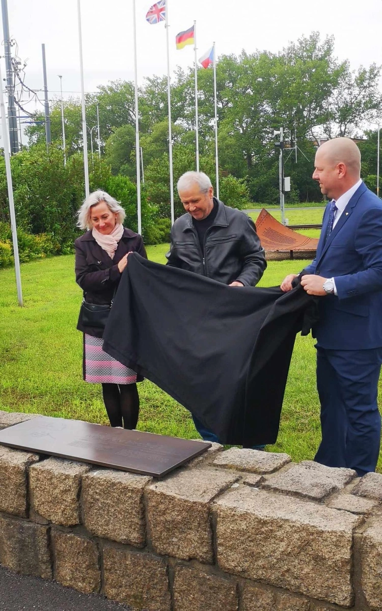 Starostka Litvínova Kamila Bláhová, Jan Hrabák a zástupce ORLEN Unipetrol Tomáš Herink při odhalení pamětní desky Miloslava Hrabáka. Foto: jip