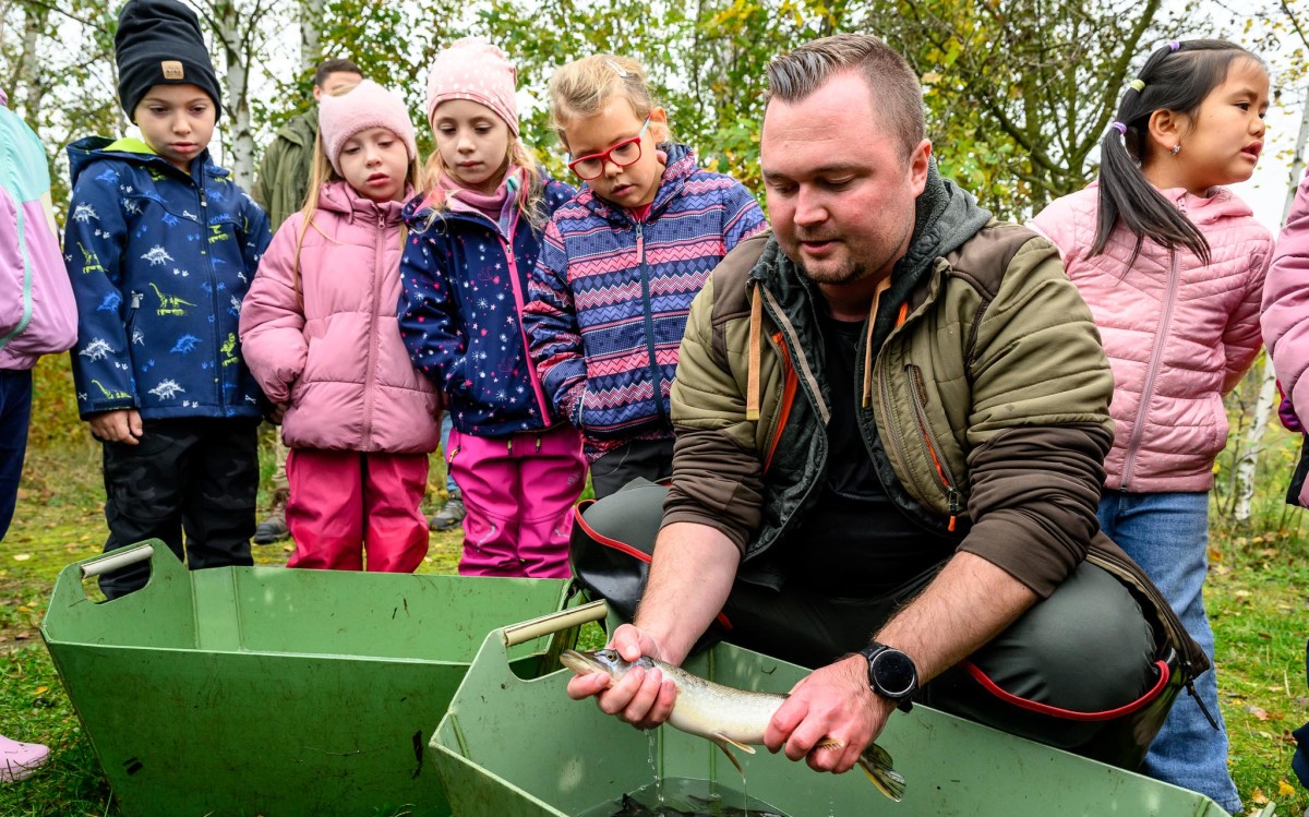 Jan Skalský z Českého rybářského svazu dětem ze ZŠ Most povídá o rybách z českých vodních toků. Děti si později mohli za asistence rybářů rybu vzít do ruky a vypustit ji do řeky. Foto: ORLEN Unipetrol