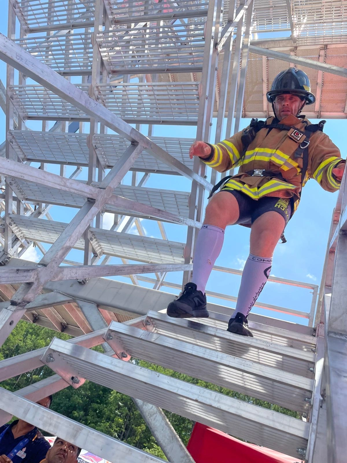 Poslední etapa je jednoduchá, ale brutální na výdrž: běh k základně věže, zvednout hadici a vyběhnout s ní po schodech až na vrchol.