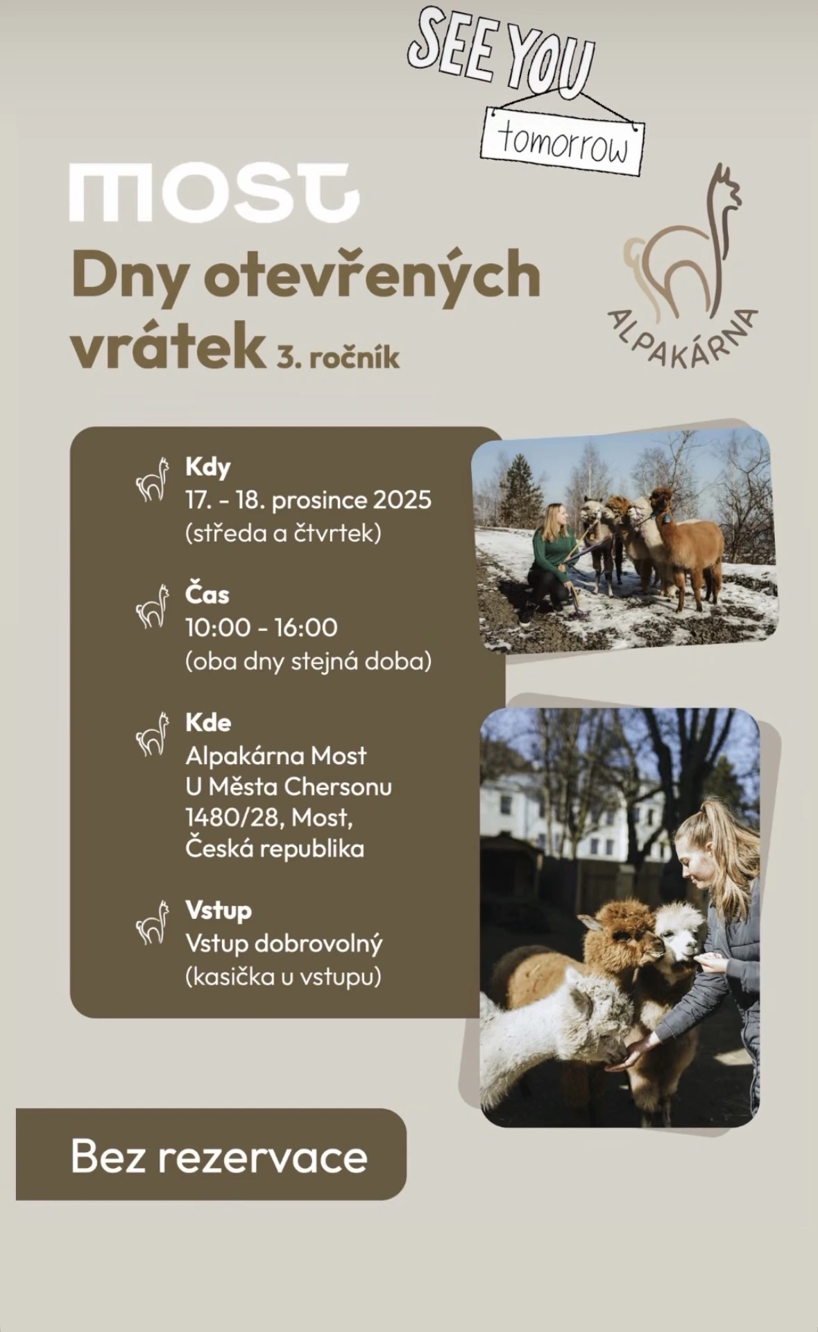 Pokud tedy hledáte únik od předvánočního shonu a chcete podpořit smysluplný projekt, zastavte se ve čtvrtek v Alpakárně Most.