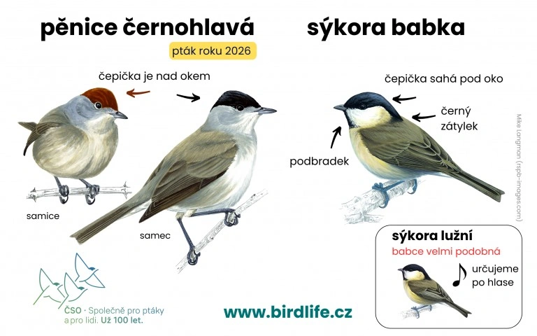 Pozor, pěnici černohlavou lze velmi snadno zaměnit za sýkorku babku. Zdroj ČSO