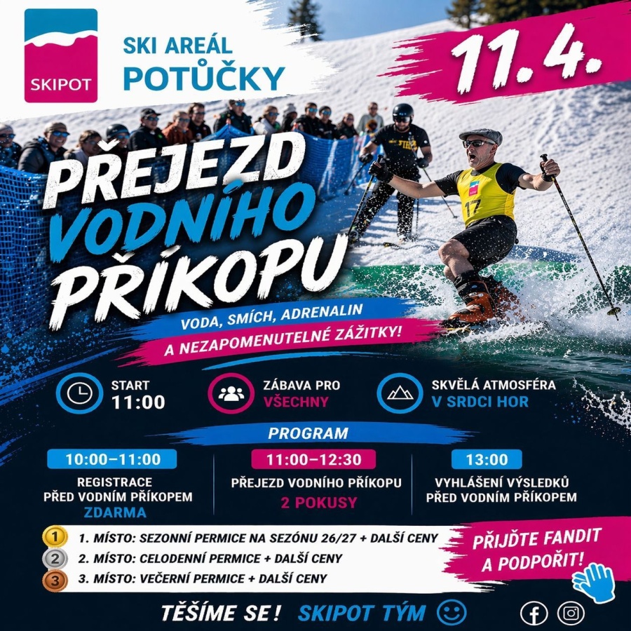 Kromě skvělého lyžování se v Potůčkách chystá i pořádná porce zábavy. Tuto sobotu 11. dubna vypukne od 11:00 legendární akce Přejezd vodního příkopu. Pokud chcete zažít kombinaci vody, smíchu, adrenalinu a naprosto skvělé horské atmosféry, tohle je přesně to místo, kde byste měli být – ať už na lyžích, nebo jako fandící diváci.